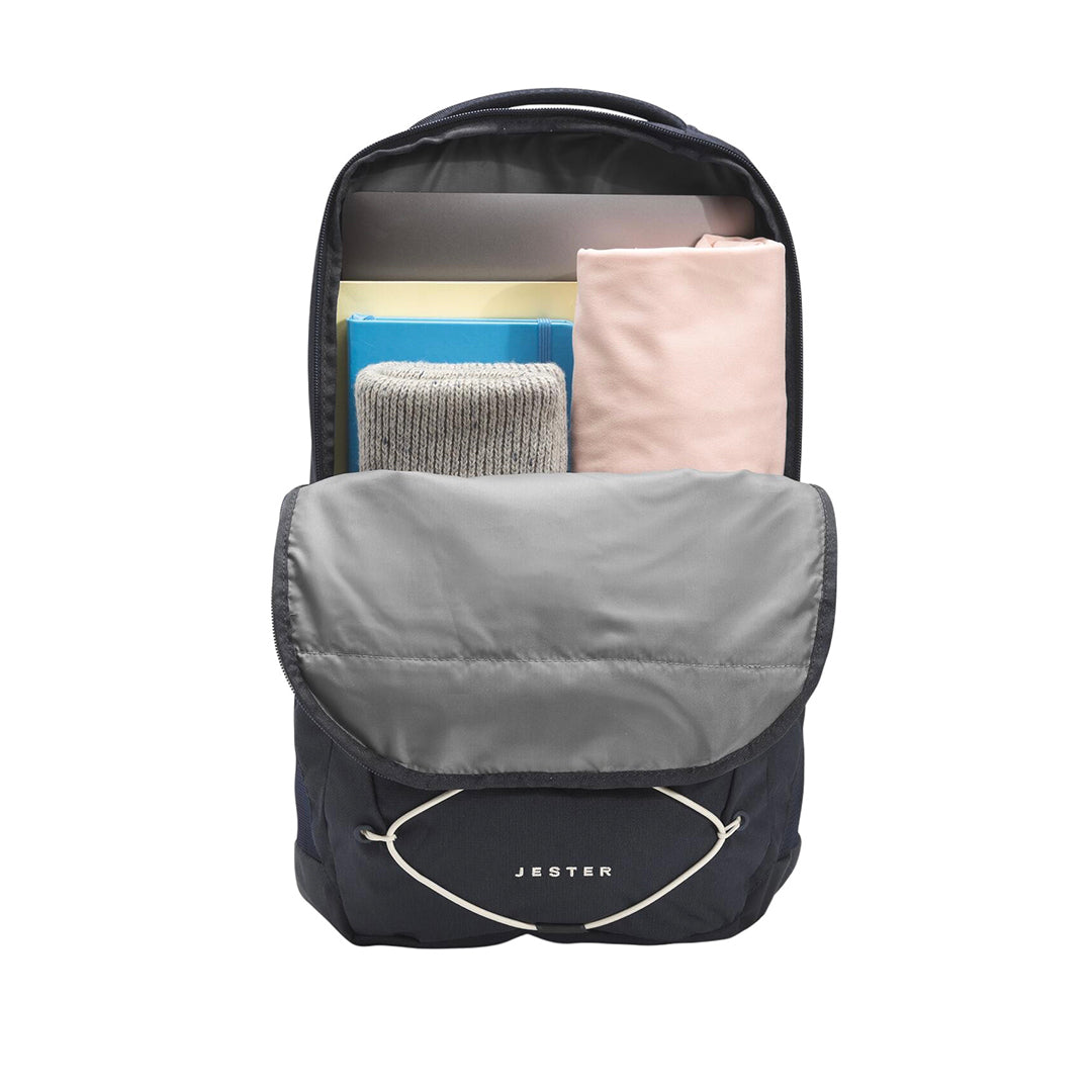 Mochila Jester unisex color navy, FlexVent™, se sostiene de pie. Funda laptop 16", organización frontal con tablet/llaves, 2 portabotellas y bungee frontal. 740 g, poliéster 600D reciclado DWR sin PFC.