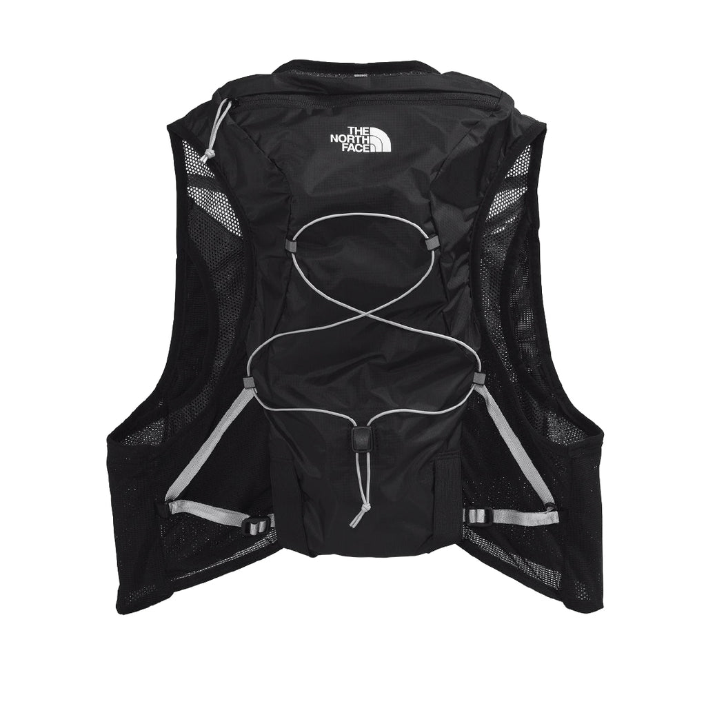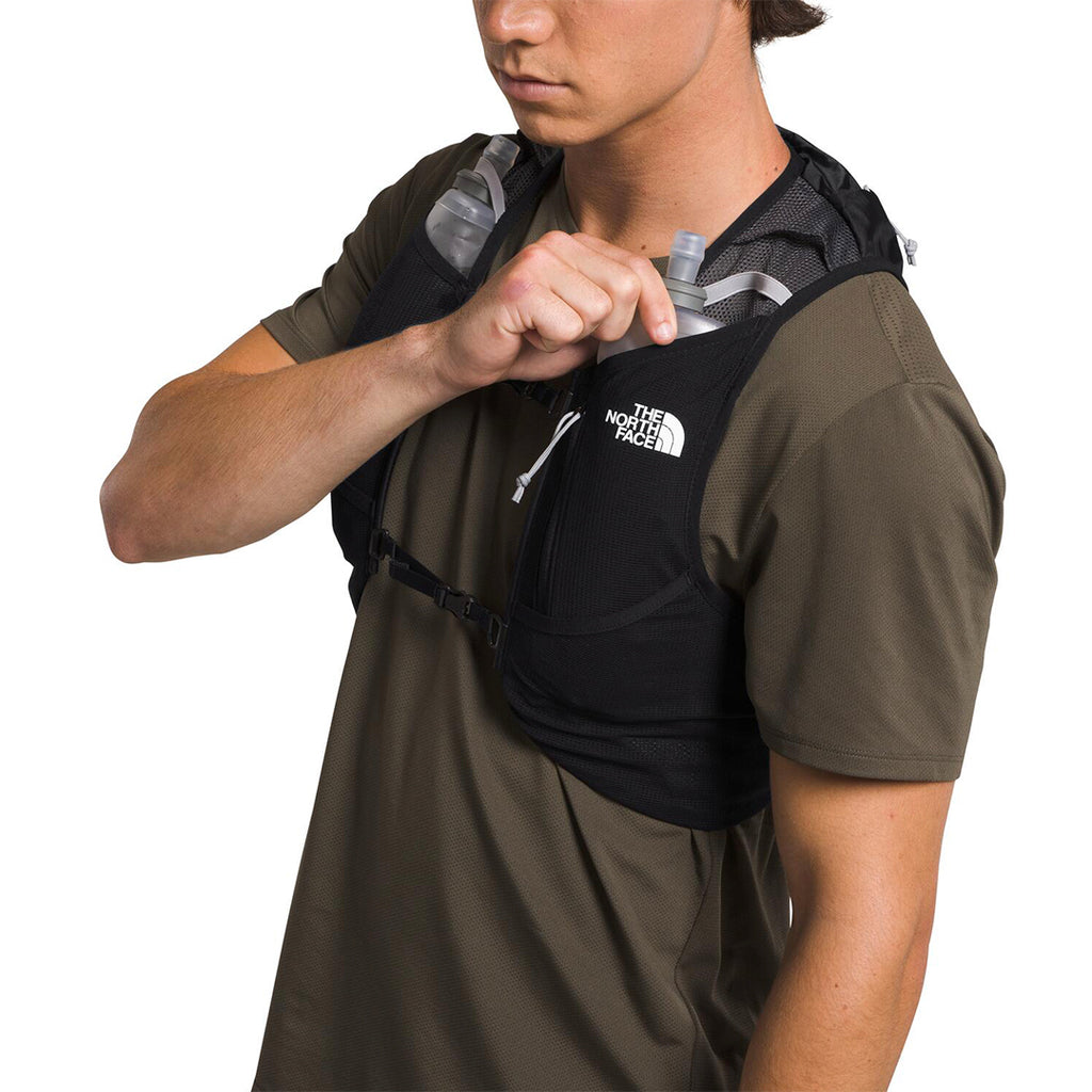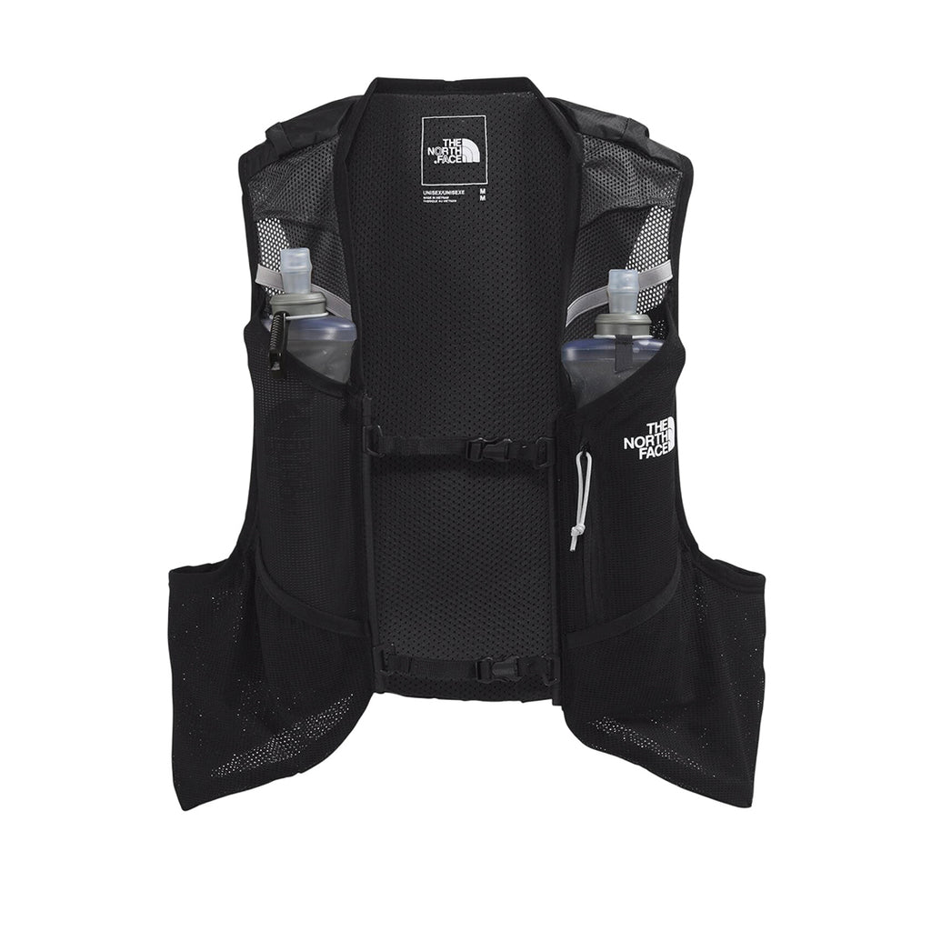 Sunriser Run Vest 8 (rojo) con arnés de malla 150D DWR sin PFC. Dos soft flasks 500 ml incluidos, compresión lateral, mochila trasera 6 L y sistema para bastones.